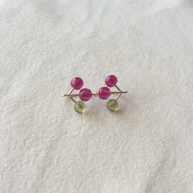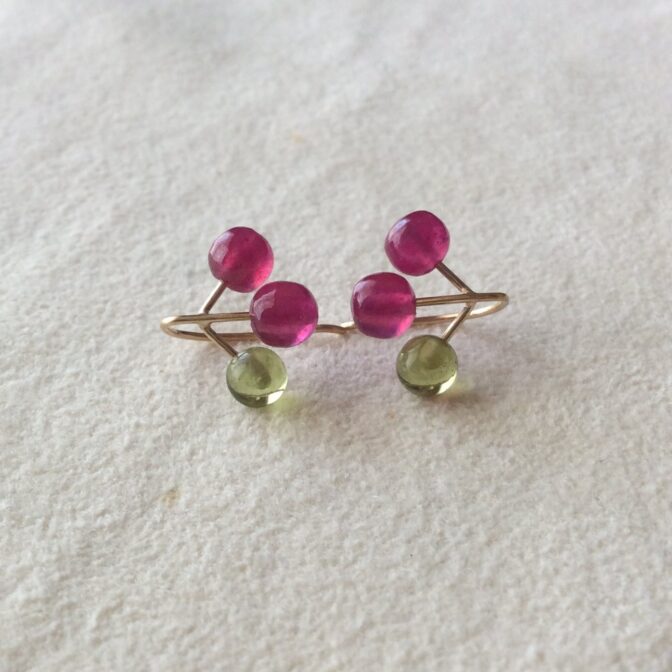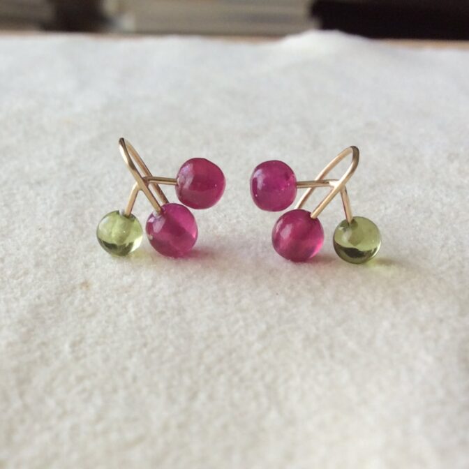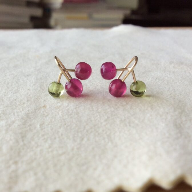 赤の2粒のルビーは、熟れた実の感じを出したくてツルツルの粒です。